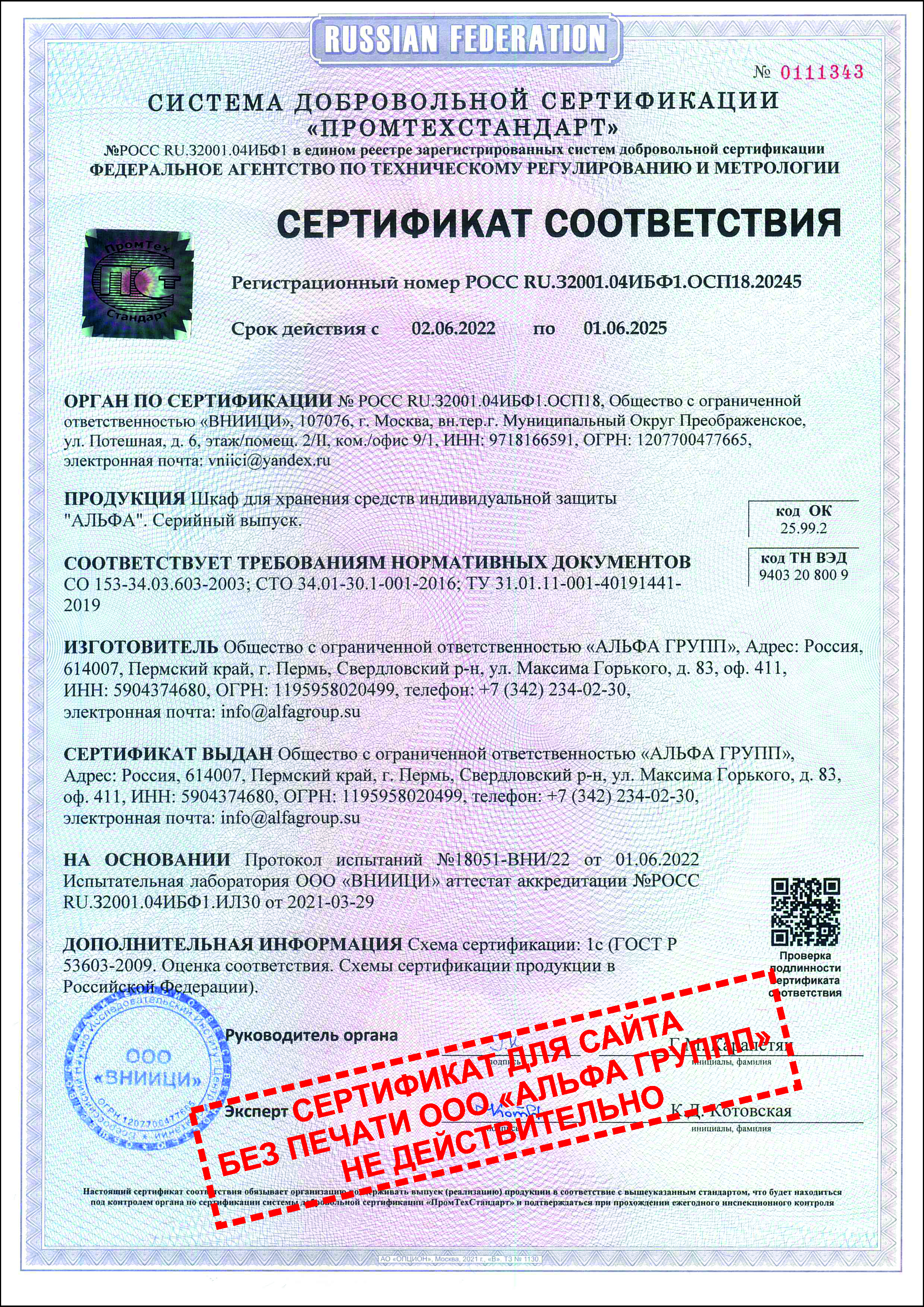 Сертификат на шкаф АЛЬФА